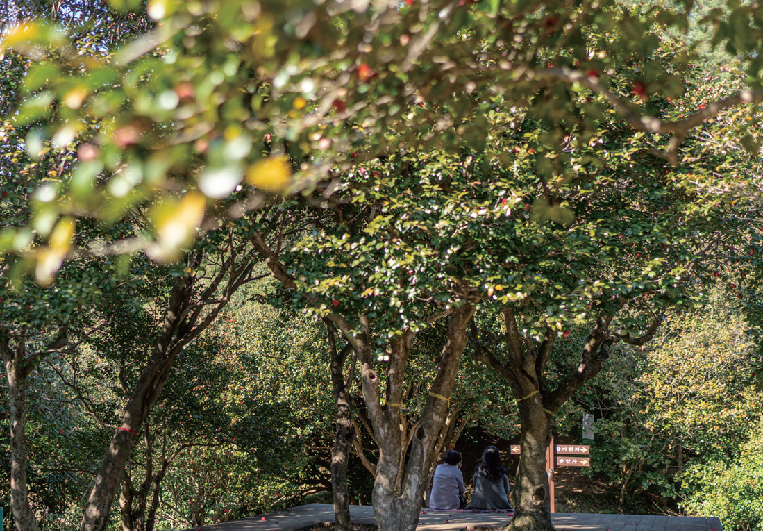 The rest area at Oknyongsa Temple Camellia Forest has a millennium-long history.