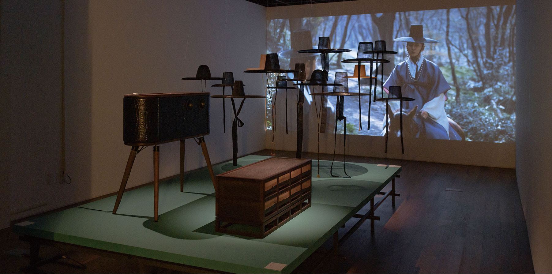 Korea’s rapid modernization and industrialization have seen the quick replacement of traditional cultural assets with modern products from abroad. Remnants of tradition have been sidelined to museum exhibitions and staged imagery. Last year, the exhibition “The Praxis” hosted by the Korea Craft and Design Foundation probed these issues. The section “Artwork, gat” displayed traditional objects of function like pottery and najeonchilgi (seashell-lacquered surface ornamentation) furniture in a manner highlighting their esthetic qualities instead of their practicality. A popular piece showed a reenacted scene from a drama (a leading actor wearing a gat while mounted on a horse) set against various gat hung at viewer eye level. Gat in red and white were also displayed to counter the all-too-common imagery of those in black. Since white hats were worn by commoners in times of national mourning, the market price of a white gat rose up to ten fold when the emperor passed away.