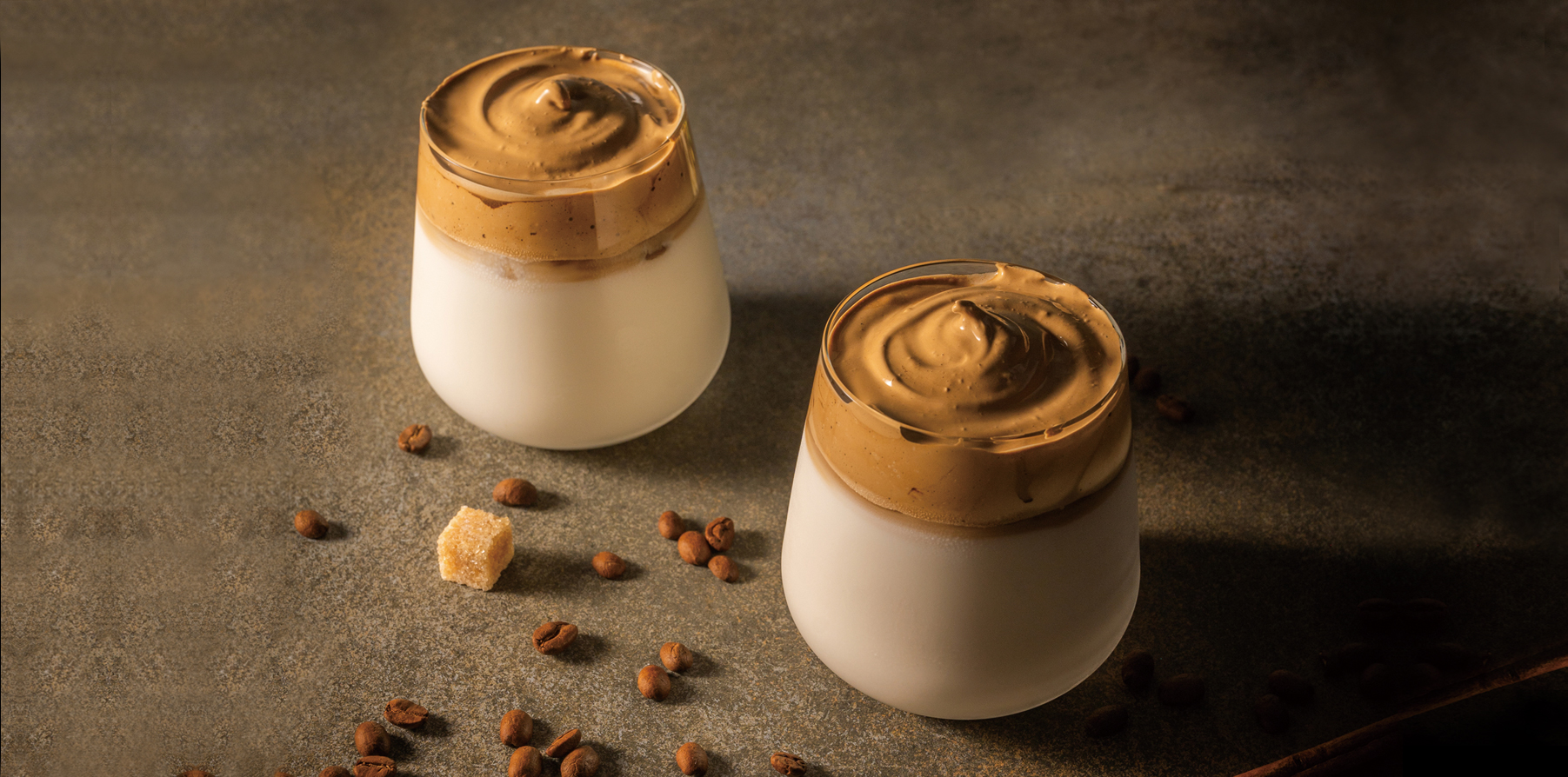 The thick, dark brown liquid of dissolved coffee and sugar lighten up in color after coming into contact with air. Though a firm and foamy appearance is the ideal outcome (for Instagram-friendly images), this makes no difference in taste. Simply scoop and lay the dalgona froth atop the surface of the milk, and consider sprinkling dalgona crumbs as a topping.