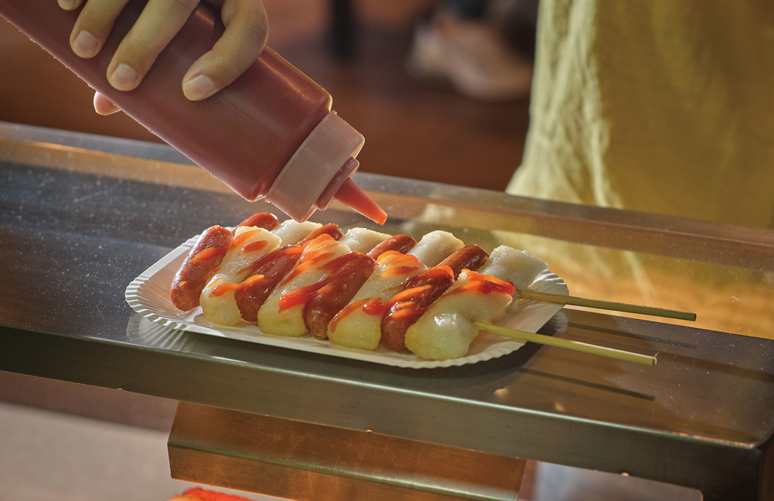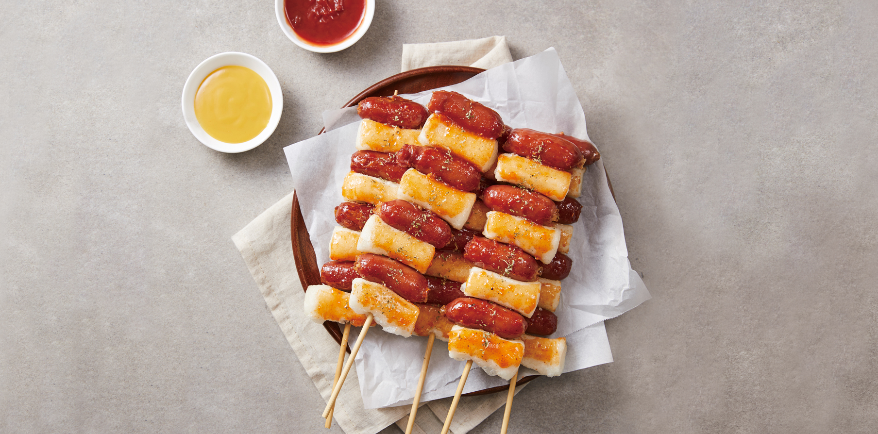 If the tteok is frozen or hardened, submerge it in water before thawing it in boiling water for a minute or two to maximize the soft and chewy texture. Then alternate the wooden skewer with sausage and tteok. Grill its well-oiled surface with a frying pan or dip in boiling oil to fry. Season with the desired sauces, with ketchup the choice for many.