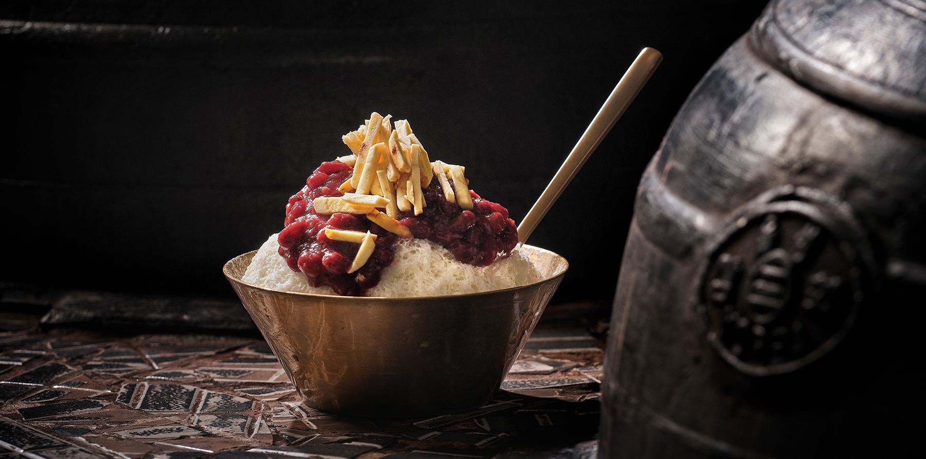 For those less familiar with East Asian desserts, pat boiled with sugar might seem an odd pair for shaved ice. But fillings featuring both ingredients are frequently used in Korean snacks, whether in summer or winter. Though the traditional pat fillings usually consist of mashed beans, the red bean paste used to top off bingsu retains its bean shape.