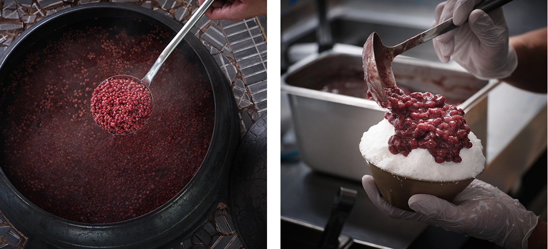Pat (red beans) are often boiled in large amounts. / Pat is scooped up atop a single serving of patbingsu (shaved ice dessert with red bean paste). One serving of bingsu typically serves two to three people.