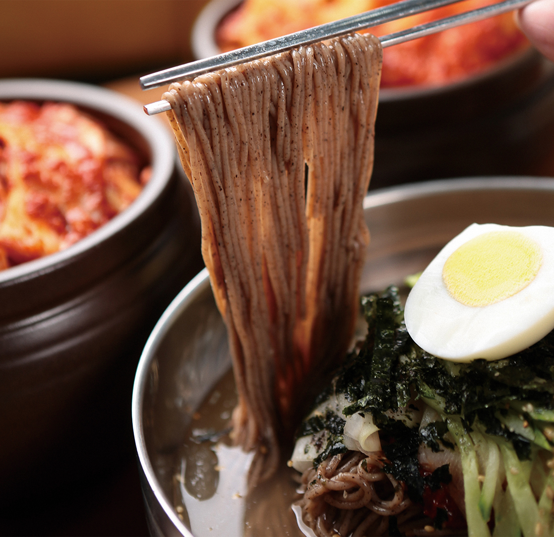 Naengmyeon (cold noodles), which originated in what is now North Korea, is great for meat lovers thanks to its rich, partially frozen beef broth flavored with pear.