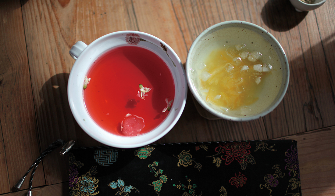 Iced omija (five-flavor berry) tea (left) and yuzu (yuja) tea (right) tend to be sweeter than regular tea but healthier than fruit-flavored drinks. Omija is a berry and yuzu a citrus fruit, and both are renowned for their distinct fragrance and health benefits. © shutterstock