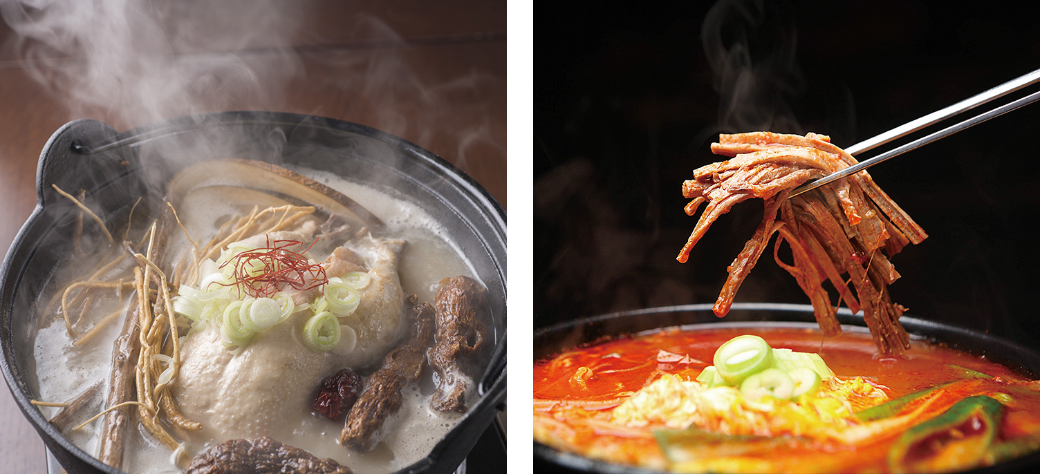 Samgyetang is a chicken soup filled with strength-boosting herbs like jujube (daechu) and ginseng (insam). © shutterstock / Yukgaejang (spicy beef soup) contains beef brisket, taro stems and red chili powder. © shutterstock