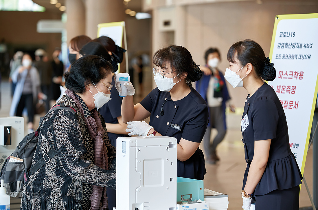 Seoul Arts Center applies stringent measures to prevent COVID-19 including temperature checks for all who enter. © Seoul Arts Center
