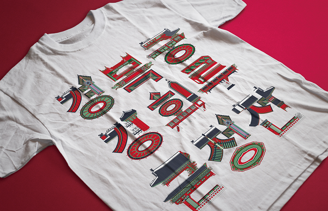 A t-shirt rendering of graphic designer Eugene (Hyun-Woo) Nam’s series of national palaces-inspired typographic work. Visit the artist’s Instagram profile @eugene_0219 for more of his work. © 2020 by Hyun-Woo Nam