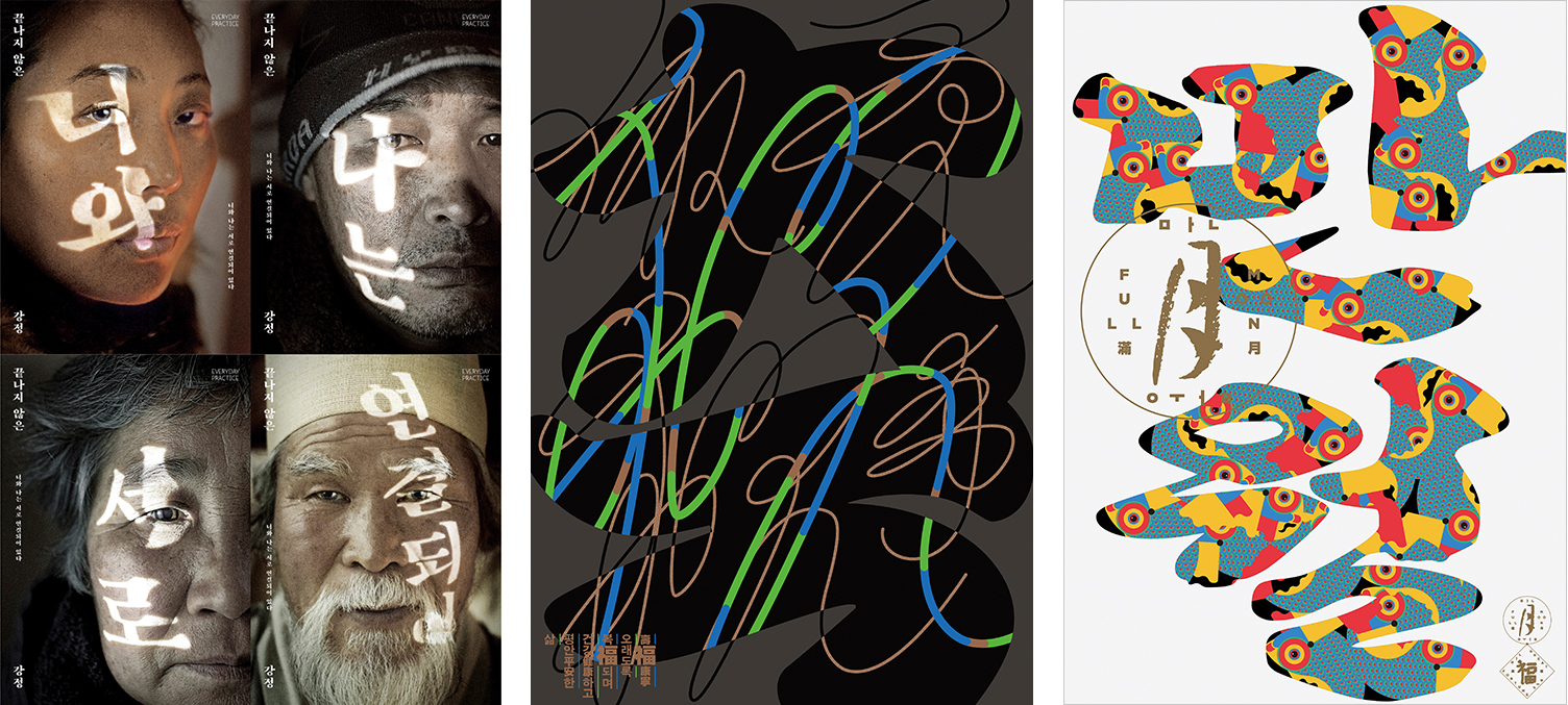 Baram-chae is Lee Yongje’s iconic “wind/hope” font featured in his project “Everyday Practice.” It reads from left to right “You and I are connected to each other.” © Everyday Practice (Left), The Seoul-based graphic designer Chae Byungrok has run the company CBR Graphic since 2014, with posters a key medium for his visual experiments. Shown on the right is his 2015 work “Celebration,” representing the Korean character chuk, and on the left is “Full Moon” comprising the Korean term manwol. © Chae Byungrok (Center, Right)