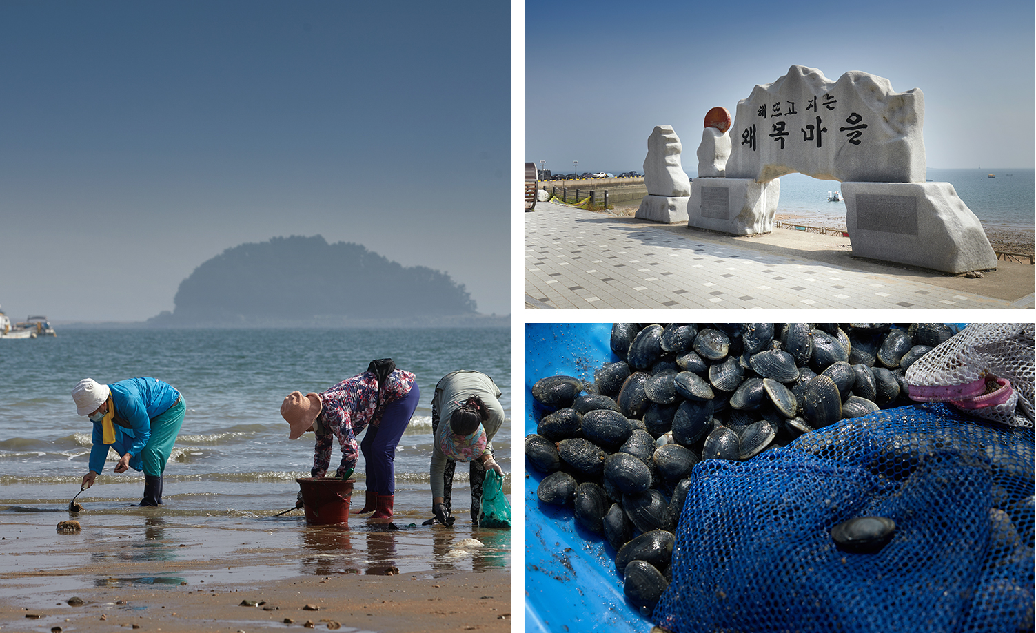 Villagers scour the tidal mud flat. (Left), A sign welcomes visitors to Waemok Maeul Village. (Righti Top), Clams and seashells comprise much of the mudflat ecosystem. (Right Bottom)