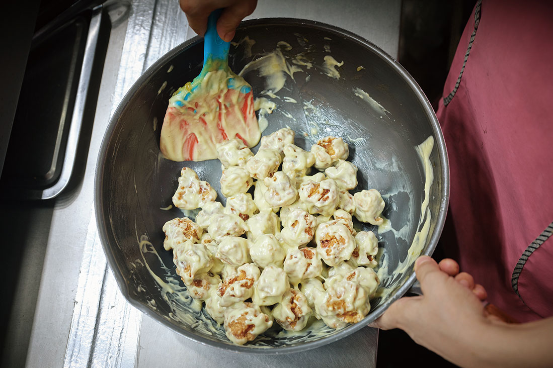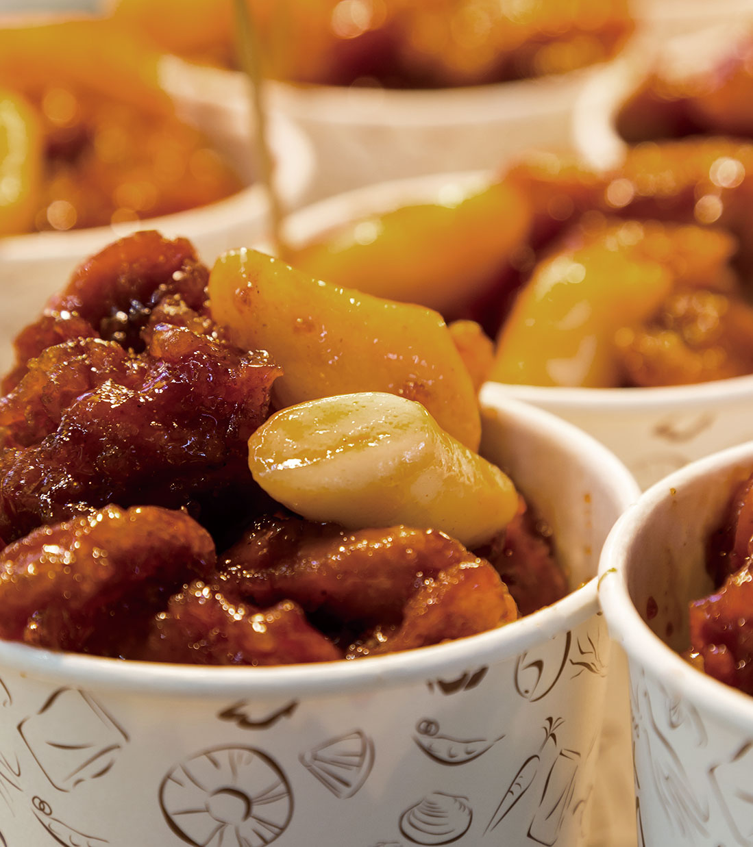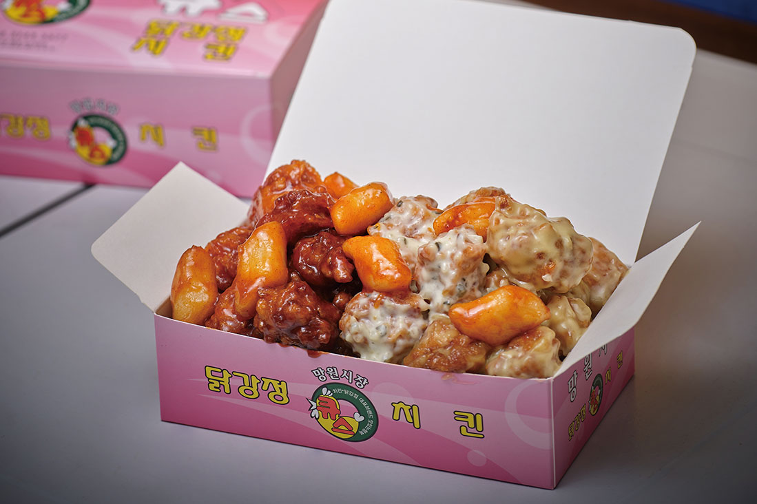 Though whether Chinese and Western variants of fried chicken inspired dakgangjeong remains unknown, the snack is generally known as fusion food with ingredients like gochujang (spicy red pepper paste) and chili powders supplemented by toppings like crushed nuts and tteok (rice cake). Other common toppings include French fries, cheese and sweet potatoes. Though the latter are the most visible of the dish’s distinguishing traits, starch syrup, with its sweet flavor and crunchy texture, is the most crucial ingredient differentiating dakgangjeong from its competitors.