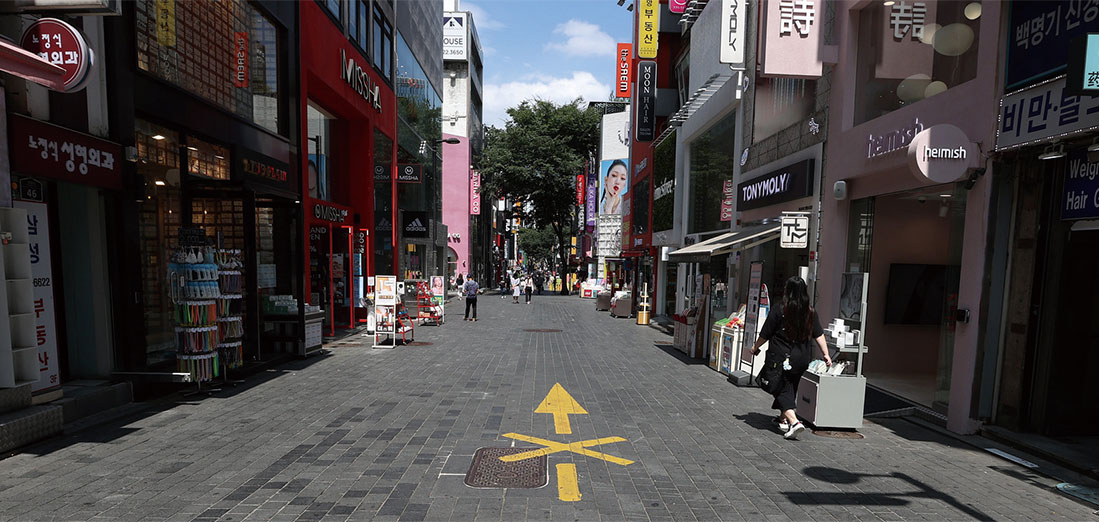 The must-stop shopping district of Myeongdong in Seoul on Aug. 26 turns into a ghost town amid a new wave of COVID-19 infections. © Korea.net
