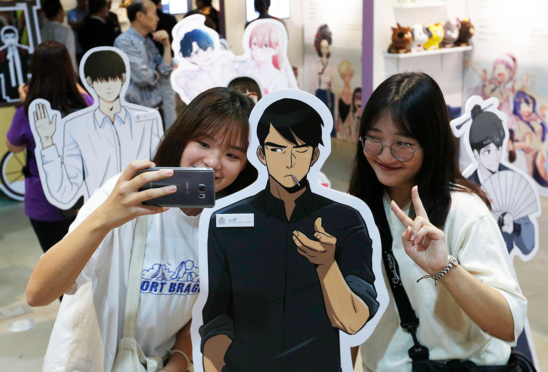 Two fans take a selfie with their favorite webtoon character. © YonhapNews