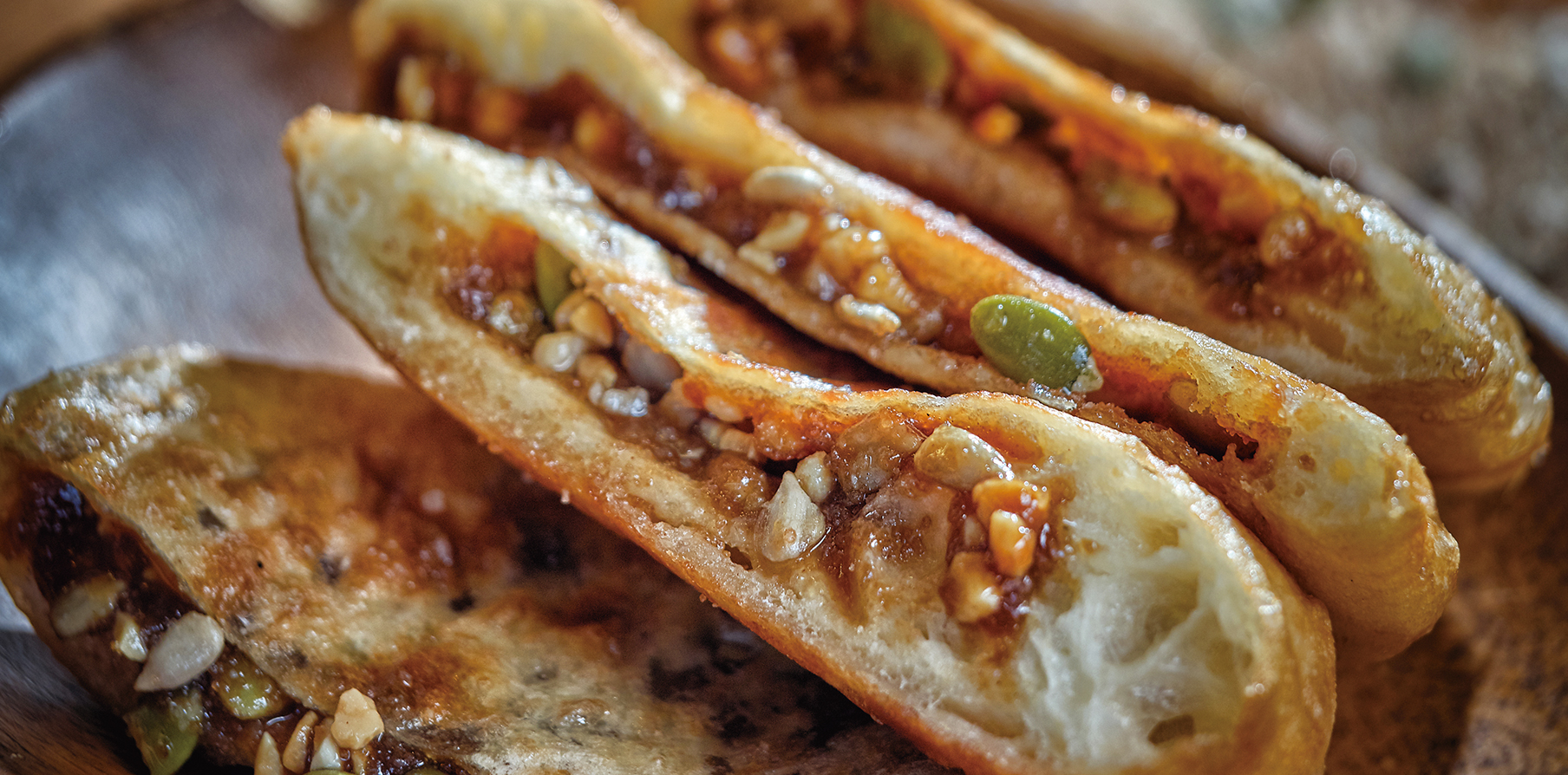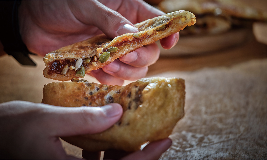 Remaining consistent throughout ho- tteok’s history is its classic fillings. Crushed peanuts are said to have been mixed into sugar as a supplement to prevent the sticky liquid sugar from drooping. Variations tend to stay within a narrow category like hotteok with seeds, sunflower seeds or assorted nuts. Though several franchises and creative vendors have introduced spinoffs like those filled with cheese, vegetables or kimchi or those made with glutinous rice, the classic version remains the most popular by far.