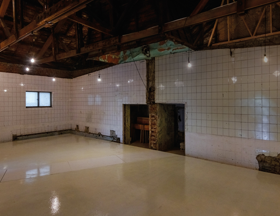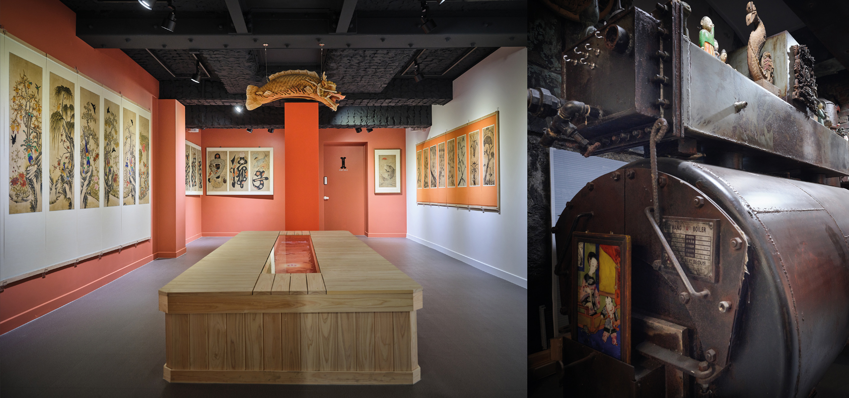 Prominent parts of the gallery’s interior are refurbishments of its bathhouse features (the tub on the left, and boiler on the right).