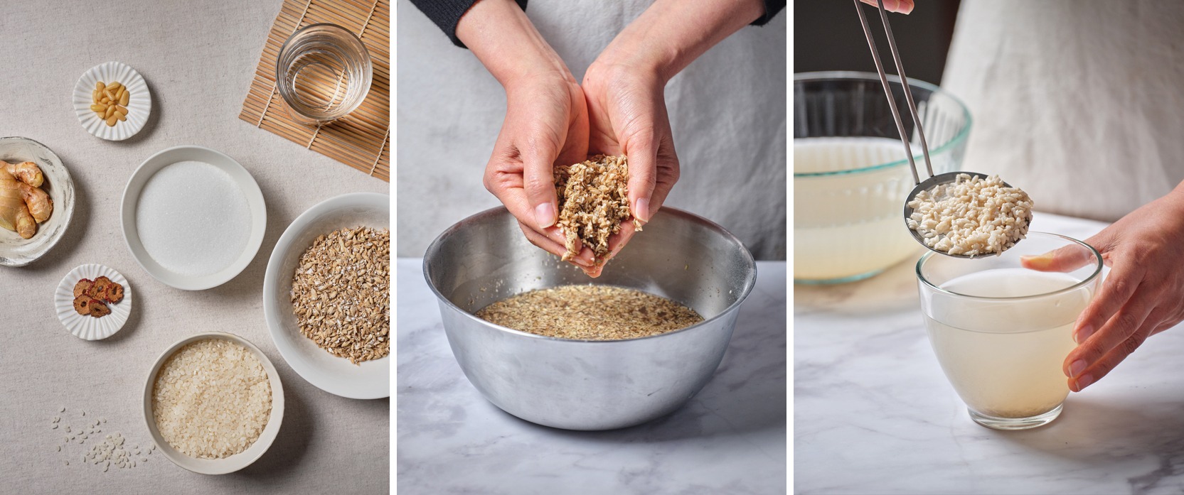 To make sikhye, the steamed rice must sit in hot (not boiling) water where it brews before it is eventually boiled, releasing the natural sweetness from its carbohydrate-rich ingredients. This process ferments the rice, causing enzymes to convert the starch into sugar.