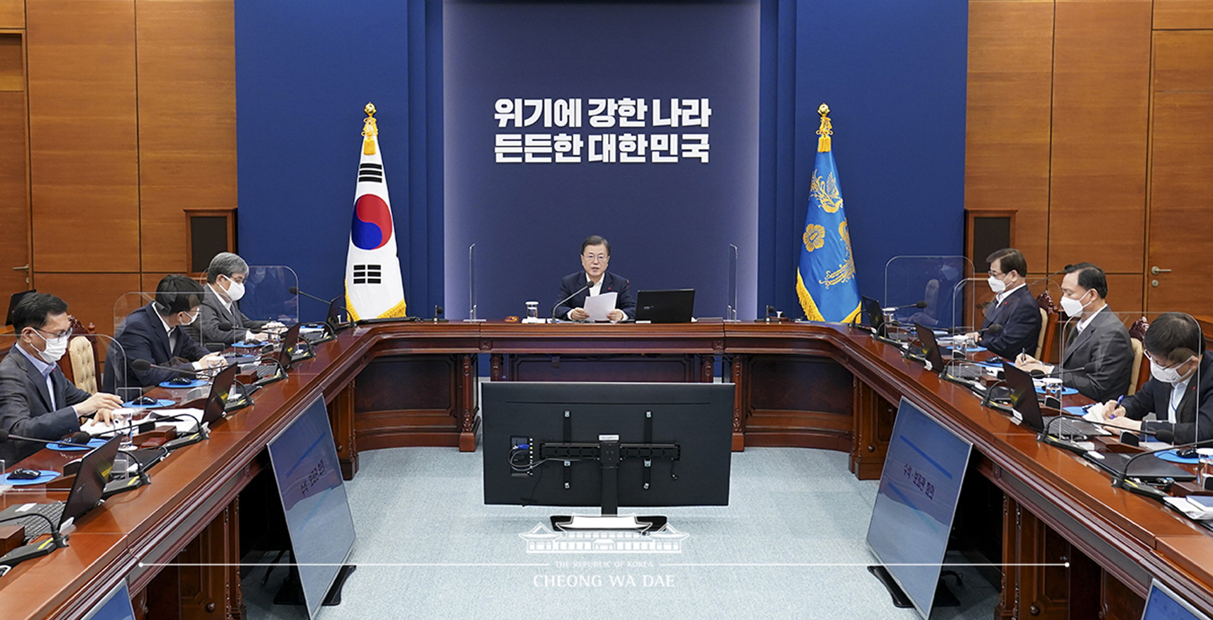 President Moon Jae-in on Dec. 28, 2020 chairs a meeting with his senior secretaries on the government’s response to the spreading pandemic.