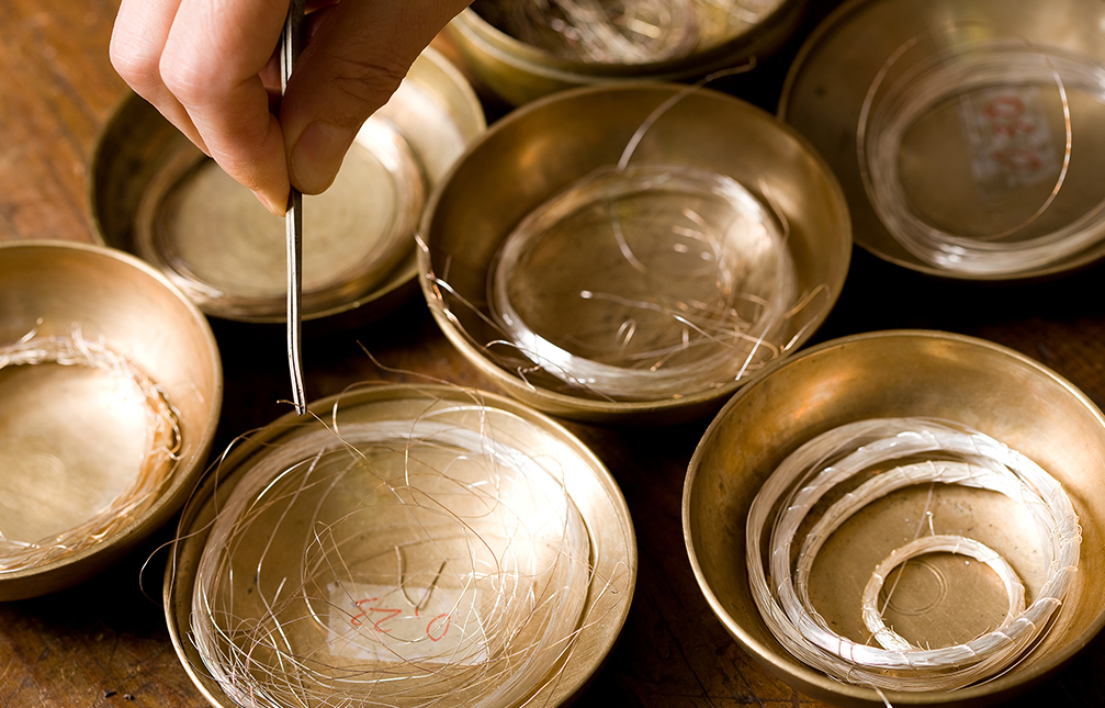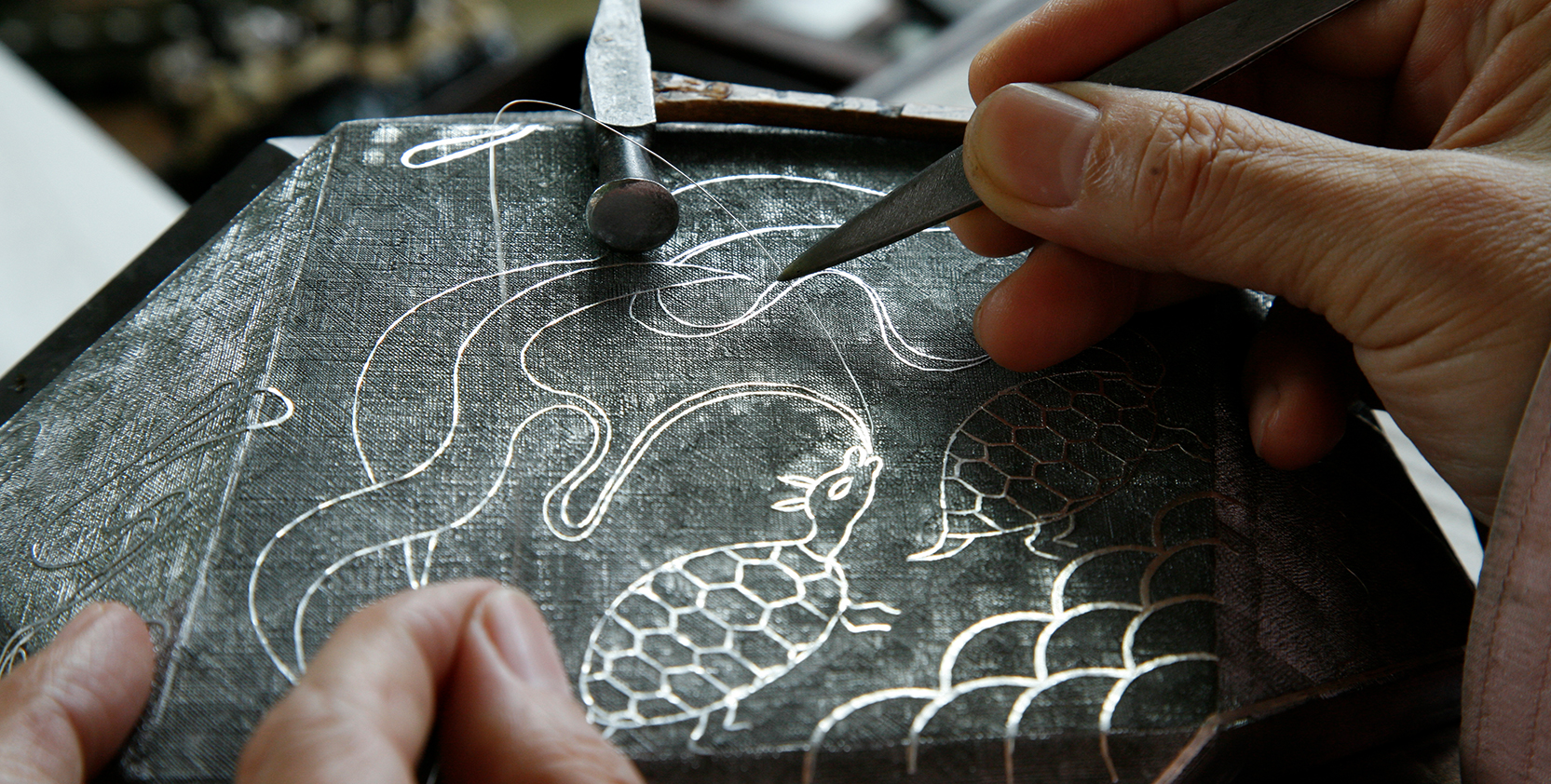 Government-recognized master Hong Jung-sil, has been striving to keep the craft alive since the 1970s. She learned the art from the last living master of the Joseon era. Her creative works have drawn attention from not only buyers and overseas museum directors, but even from major Korean corporations. Sulwhasoo, a makeup brand of Korean cosmetics giant Amore-Pacific, released in 2018 a series of inlaid compacts as a collaboration with Hong. The compacts feature beautiful inlaid designs of trees, waterfalls, animals and other traditional motifs. Not only are the compacts works of art, but they also demonstrate that traditional metal craft can continue to have a place in daily life.