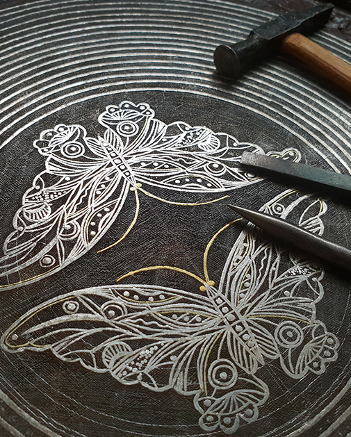 The second one, which developed during the Joseon era (1392-1910), involves making broader incisions into the metal surface using a chisel, then hammering silver or gold plates or string into them.