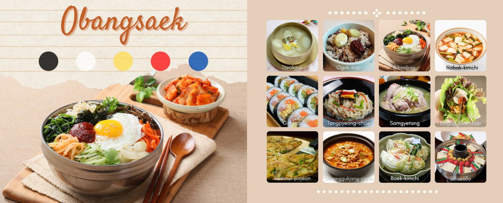 Harmony and balance are integral to Korean culture. Thus obangsaek, the traditional Korean palette of the colors white, black, green/blue, red and yellow, constitutes much of Hansik (traditional Korean cuisine) are prepared in accordance of the beauty and harmony of obangsaek. By cooking in balance with these five colors, one is said to absorb the energy of the universe.