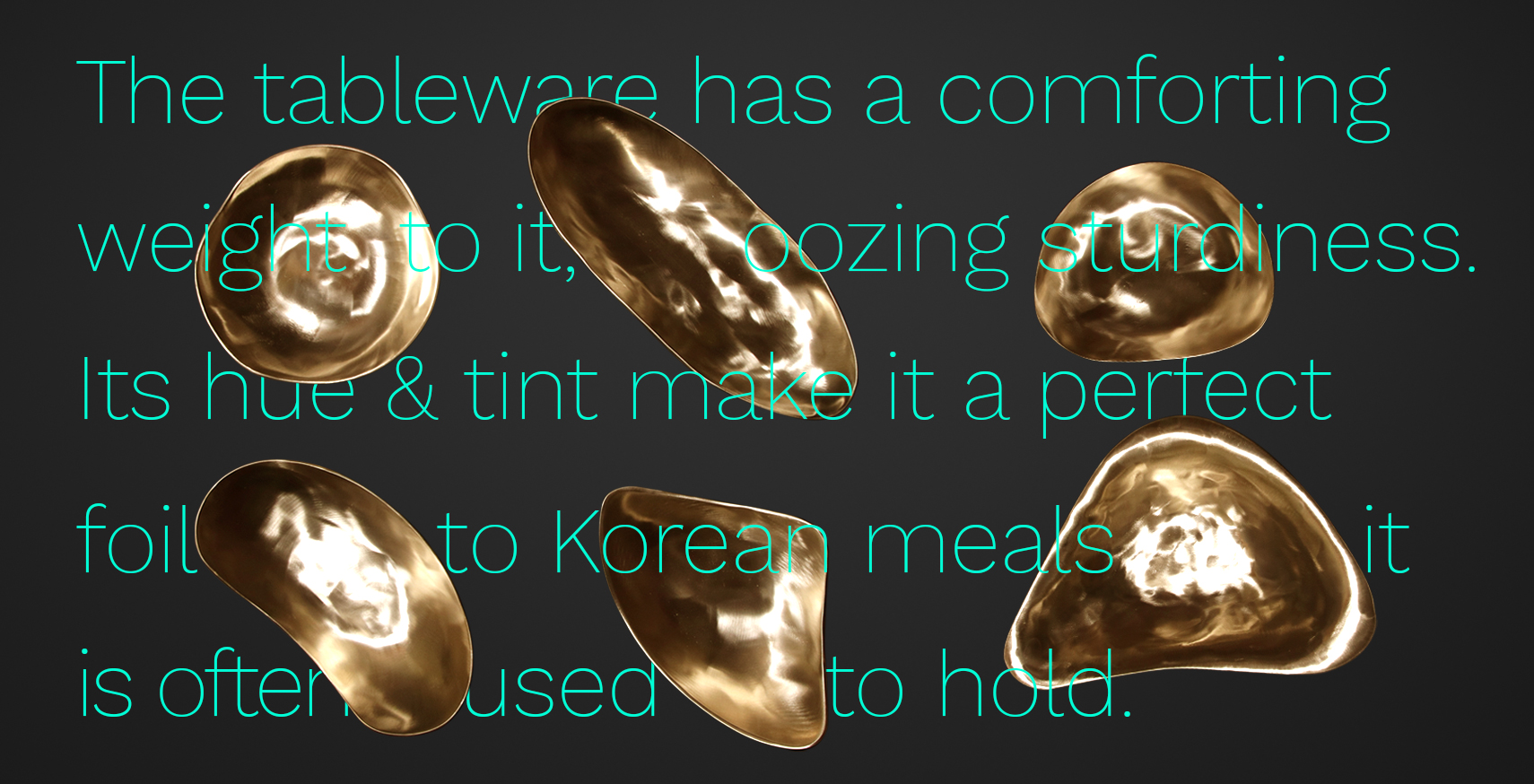 Yugi tableware has a comforting weight to it, and oozes sturdiness. It also has a stunning reddish gold hue that makes it a perfect foil to the steaming white rice that makes up the backbone of most traditional Korean meals. At once, you feel your mealtime has been elevated. It is almost impossible to bolt down your food hastily if you first need to remove a weighty bronze lid before you can access it.