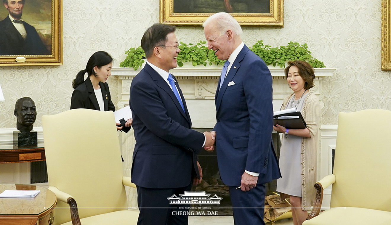 President Moon Jae-in shakes hands with President Joe Biden at the White House on May 21.
