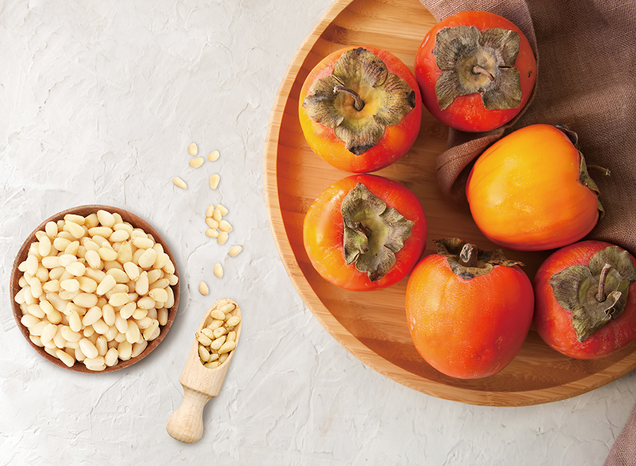 Pine nuts and persimmons are some of autumn’s tastiest delights. © Shutterstock