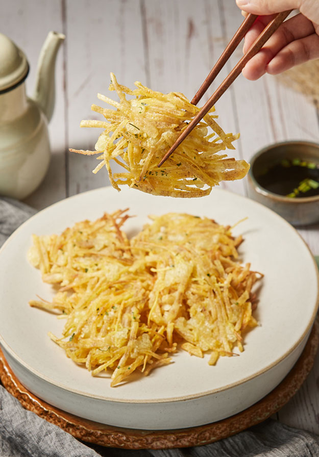 Dangamjeon requires less time and effort but still some attention to detail. It’s important to choose persimmons that are still firm to the touch but not unripened because the high levels of tannins will taste bitter and dry. The leafy green top of a ripened persimmon will pull off easily, but there shouldn’t be too much space between the leafy top and the rest of the fruit. The rest is easy. Slice the persimmons into julienne strips, add the strips into a store-bought pancake batter (buchim garu), and then fry dollops of the mixture in oil. Serve the persimmon fritters with a bowl of jatjuk, and you’re guaranteed of a nutritious and comforting meal fit for a king.
