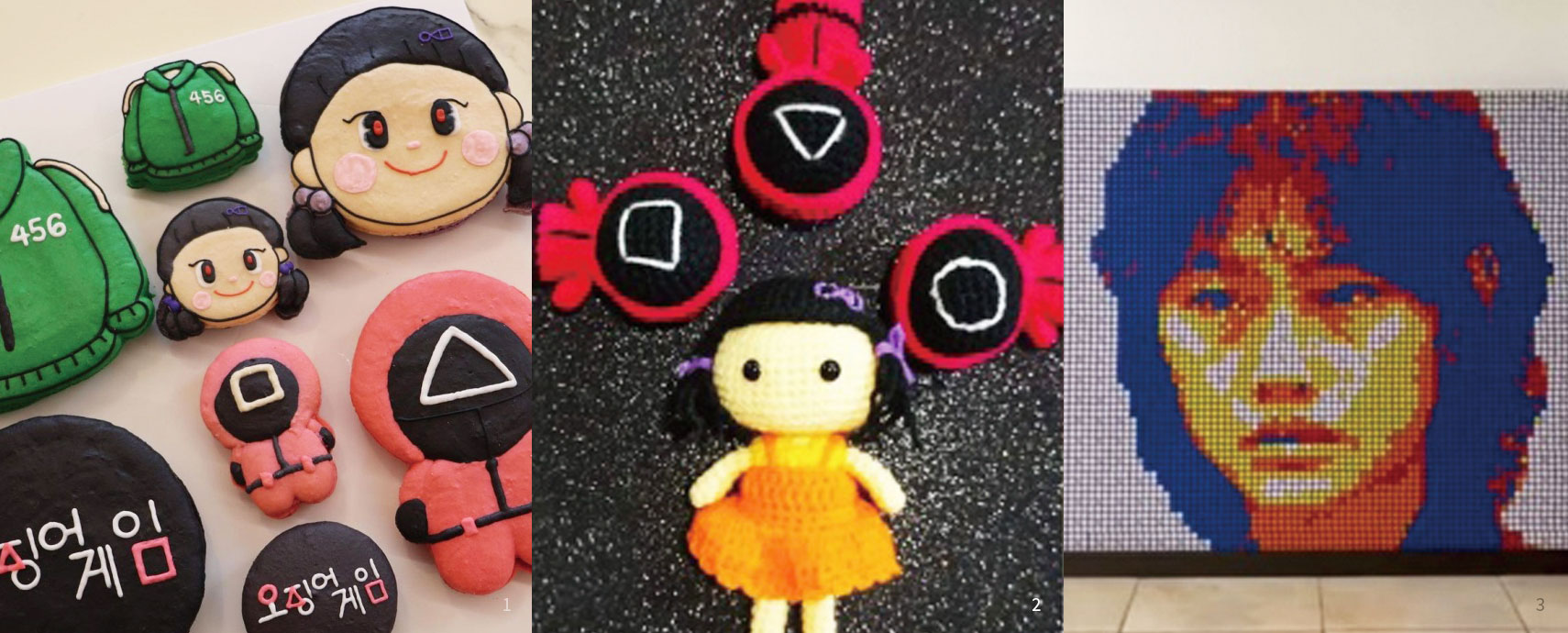 Amigurumi is the Japanese art of knitting or crocheting small creatures using stuffed yarn. Sachini Senanayake from Sri Lanka makes made amigurumi versions of the series’ guards and the deadly doll in Red Light, Green Light.