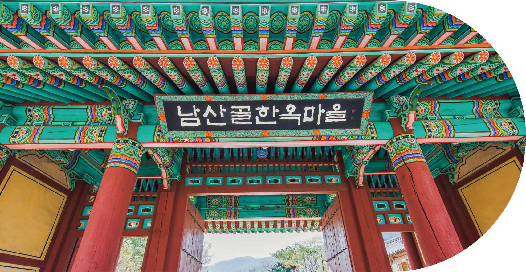 A signboard written in Korea’s indigenous alphabet, Hangeul, hangs above the entrance of Seoul’s Namsangol Hanok Village. ©clipartkorea