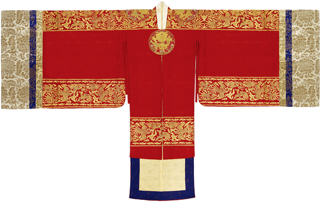 The robe of the royal family is adorned with phoenixes and a dragon.
