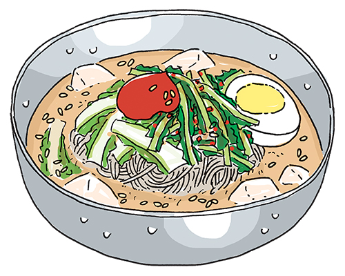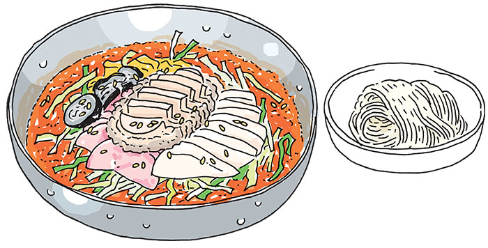 A summer specialty, naengmyeon banishes the summer heat with its chilled broth. Of the many regional varieties of naengmyeon, Incheon’s Hwapyeong-dong naengmyeon is famous for being cheap and plentiful. It began in the 1970s, when workers at nearby factories would continue ordering more and more noodles until somebody just filled up a bowl the size of a washbasin with noodles. Workers and students with more hunger than pocket money got word of this, and Hwapyeong-dong naengmyeon caught on so that there’s now a whole neighborhood of shops.