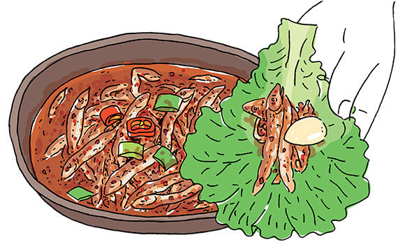 A summer specialty of Gangwon-do Province is mulhoe, a bowl of chilled meat broth, tangy seasonings and fresh fish. The dish began with fishing boat crews who would slice up their commercially worthless fish, put it in cold water, add red pepper paste and sesame oil, and drink it up like a soup. It’s now a popular dish along Gangwon-do Province’s coast and Pohang. With halibut, squid, sea cucumber and other maritime delights, the “everything mulhoe” of Goseong is particularly distinct. The broth is both sweet and tangy, prepared with red pepper paste, cucumber, pear and sugar. In Goseong, you add in guksu noodles after you’ve finished the fish.