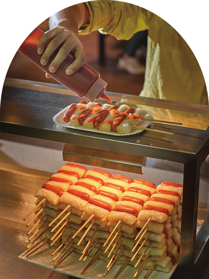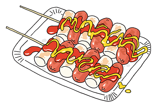 Sotteok-sotteok, a snack in which Vienna sausages and rice cakes are alternately sandwiched on a skewer, has a shorter history than other highway rest area snacks. First sold in 2010, sales surged after a comedian ate sotteok-sotteok on TV in 2018. The snack quickly became the new powerhouse highway rest area snack. You can add as much sauce as you want to the skewer (such as ketchup, mustard, or chili) as well as toppings like nuts. The point is to eat Vienna sausage and the rice cake together.