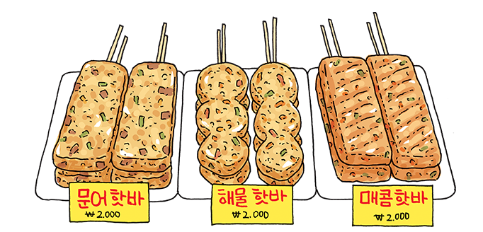 The Sintanjin Rest Area sells such a wide variety of hatbas that it’s called the “hatba department store.” The deep savory flavor of the seafood hatba, made from a combination of ground seafood, is the most popular one.