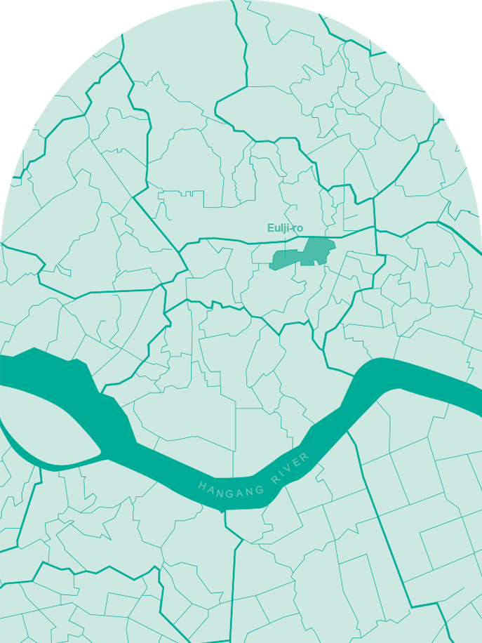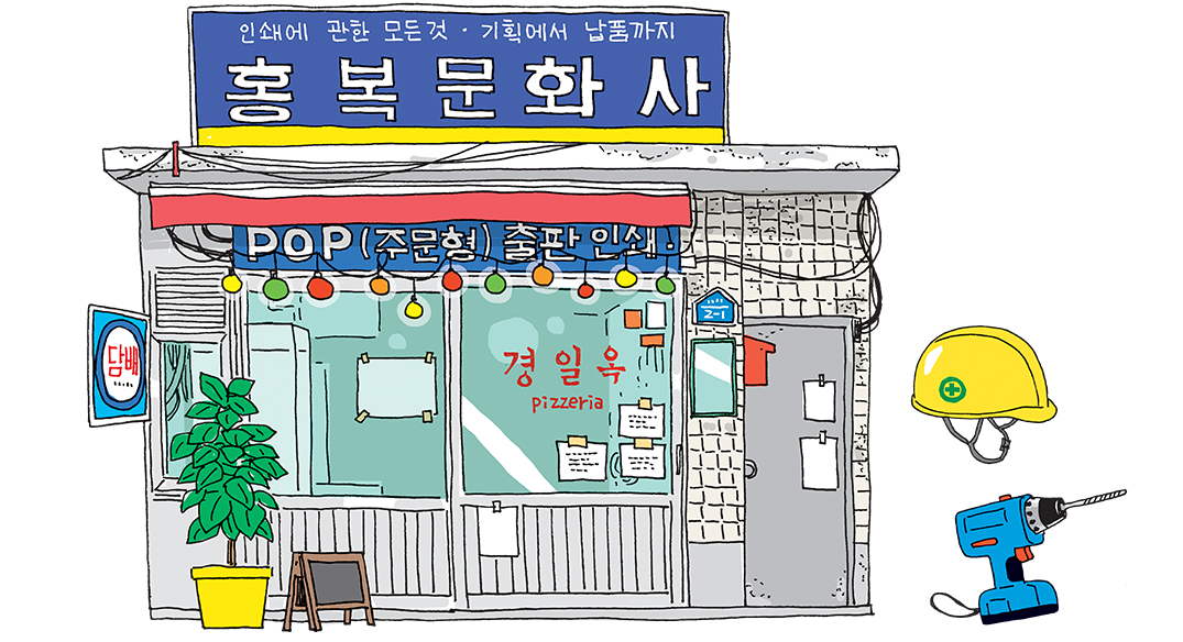 Eulji-ro is the center of the wave of “newtro culture” that has recently hit Korea with a vengeance. The district features printing shops and maintenance shops, interspersed with galleries, cafes and restaurants. For example, a famous pizza joint in the area took over a small printing shop, leaving the printing shop’s old signboard intact. As it coexists with the past, the pizza shop attracts a great deal of business.