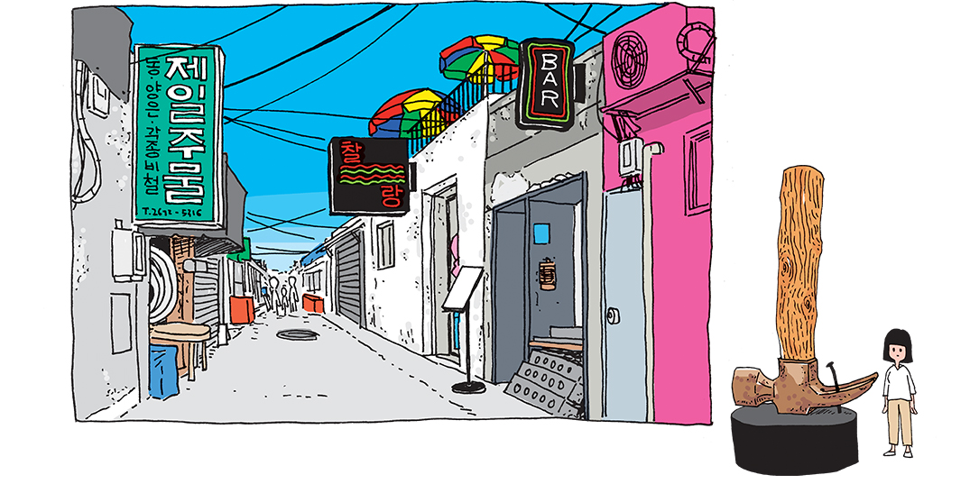As rents continued to rise in the area, the ironworks and many artisans were forced to move elsewhere. It would be no exaggeration to say that half of the ironworks street is now full of cafes and restaurants. There are still many traces of the artisans left in Mullae-dong, however. Visitors can see colorful wall paintings and a diversity of sculptures as they stroll the area.