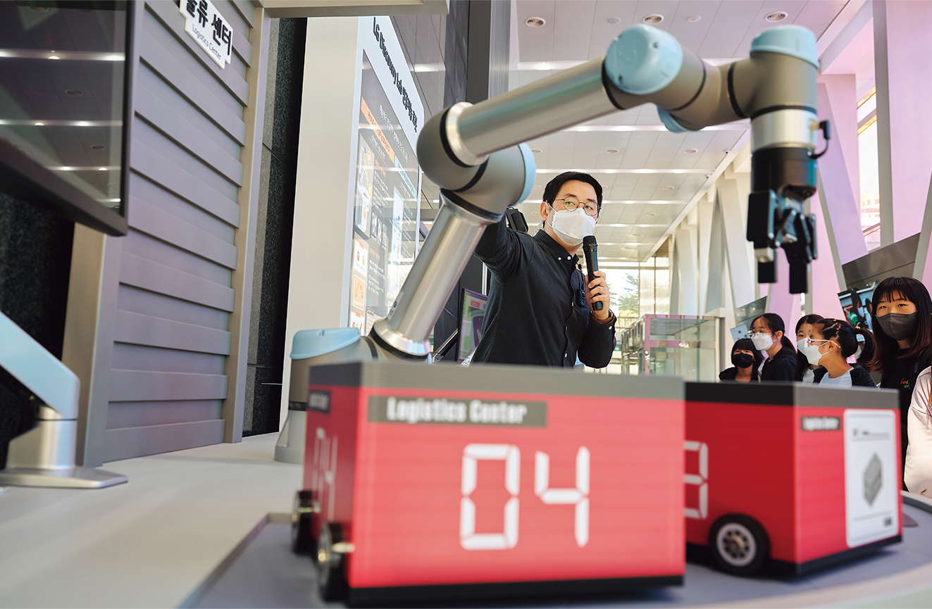 Students listen to an explanation of the AI picking robot, the main exhibition at LG Discovery Lab in Busan.