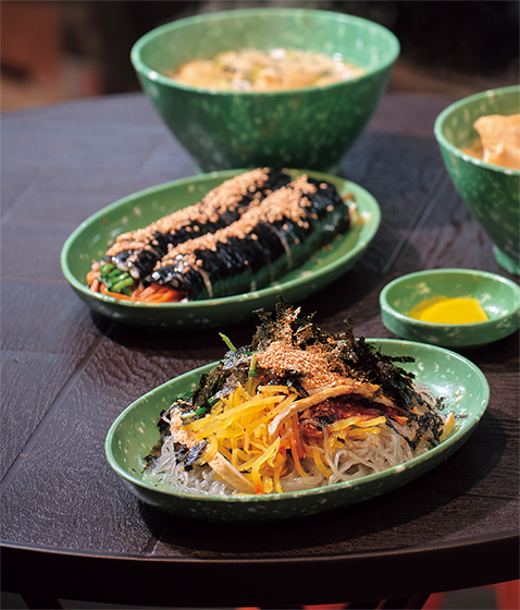 Especially in Busan, bibimdangmyeon can be pur-chased from a wide variety of food stands and restaurants in the Gukje Market. The seasoning for bibimdangmyeon is straightforward, yet each person may have their own formula for taste. Its ingredients are red pepper paste, sugar and sesame oil. Pickled radish, chives and seaweed are added as garnish.