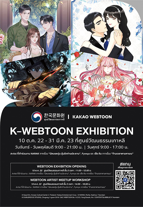 Poster of the ‘K-webtoon Exhibition’ held at KCC Thailand“Webtoons,” which originated in Korea, refer to digital cartoons serialized on media platforms. When the word webtoon first took off in 2000, it was regarded as an unfamiliar fringe culture in Korea and abroad, but it has imposingly established itself as a globally dominant medium today.