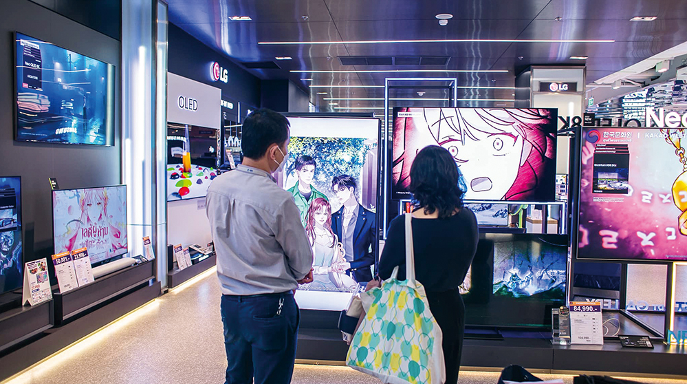People watch webtoon videos played in a shopping mall in Bangkok.The webtoon that the Korean Cultural Center in Thailand produced on its own to make known the historical facts about the Korean War to Korean and Thai teenagers drew a lot of attention, surpassing 250,000 views on the Kakao Webtoon Thai platform within three days of its publication and ranking 11th in the overall popularity list. This attempt is particularly significant in that it showed a new model of soft power exchange between the two countries, and was well-received by young people through appropriate media.