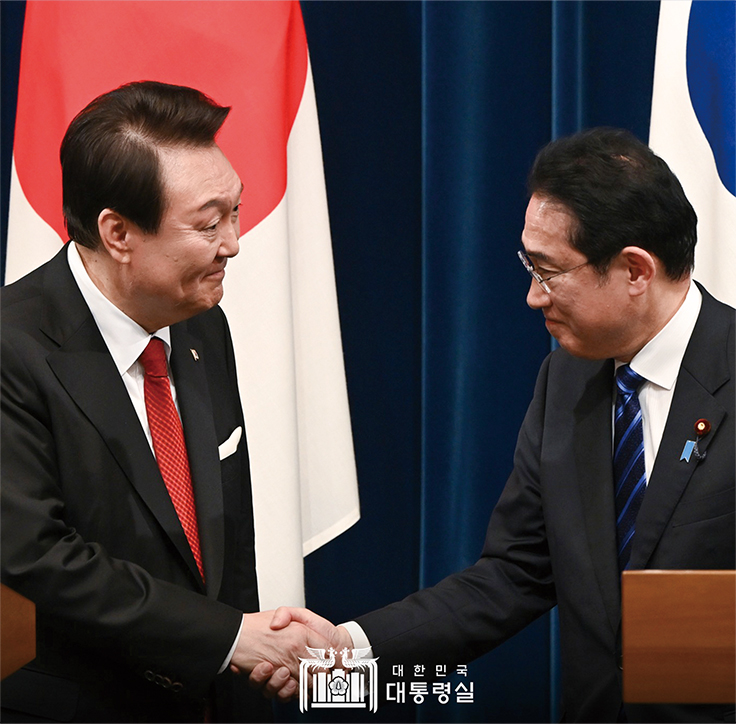 The leaders of Korea and Japan on Mar. 16 shake their hands. © Office of the PresidentA big step was taken in the strained Korea-Japan ties when South Korean President Yoon Suk Yeol on Mar. 16 held summit talks with his Japanese counterpart.