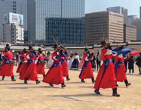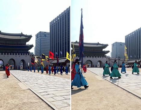 I visited Gyeongbokgung Palace on March 6 right before the second ceremony of the day was about to start. The clock struck 2 p.m. and the ceremony began with a traditional music band playing instruments like drums, taepyeongso (double-reed oboe) and jing (gong), followed by the palace guards marching toward the gate in their colorful uniforms. Seeing a ceremony that has been performed with a long history was both beautiful and captivating and felt like going back in time.