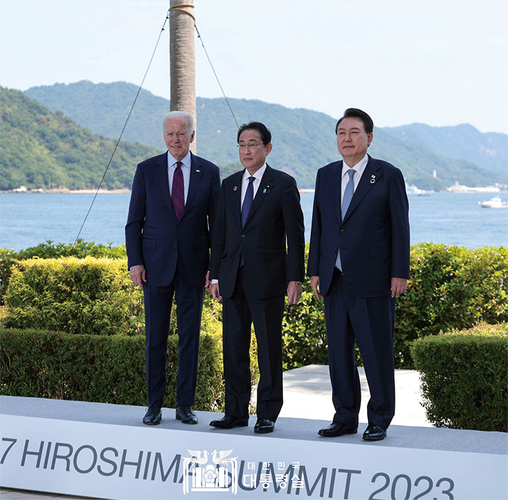 At their talks held at Grand Prince Hotel Hiroshima, the venue of the G7 summit, the three leaders agreed to develop their three-way cooperation to a new level, presidential spokesperson Lee Do Woon said in a news release.