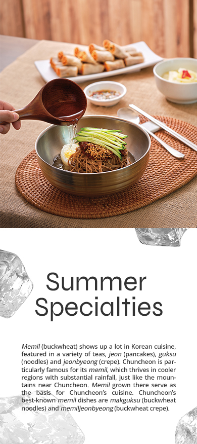 Memil is a fantastic food, rich in both flavor and nutrients. It’s full of fiber, which keeps things moving through the intestines, along with Rutin, which is beneficial for hypertension and diseases of old age. Memil also helps cool you down, making it the perfect health food for the muggy summer months. This summer, how about heading over to Chuncheon to check out the local memil dishes? These variations on a culinary theme will make your trip a blast.
