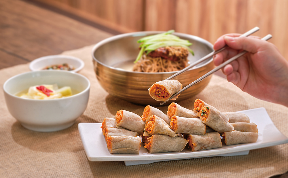 On the outside, a memiljeonbyeong might look a little like a burrito. But on the inside, the story is completely different. These crepes are stuffed with a range of ingredients, including dangmyeon (glass noodles), gatkimchi (leaf mustard kimchi), baechukimchi (napa cabbage kimchi), radishes, pork and squid.