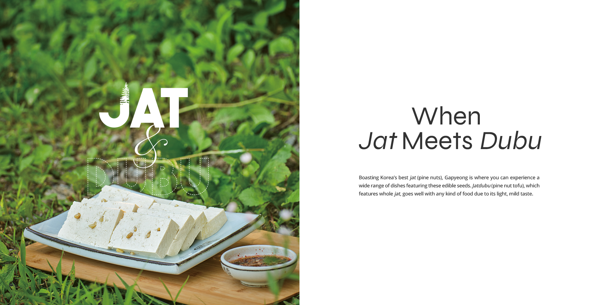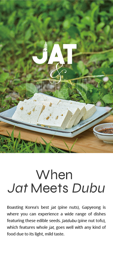 In Gapyeong, people use these good-quality jat to make a variety of dishes, including the jatdubu full-course meal, jatdubujeongol (pine nut tofu mushroom hot pot) and jatdububossam (boiled pork eaten with a salty sauce and wrapped in greens). Some of the most popular jat dishes are jatdubu and jatdubujeongol.