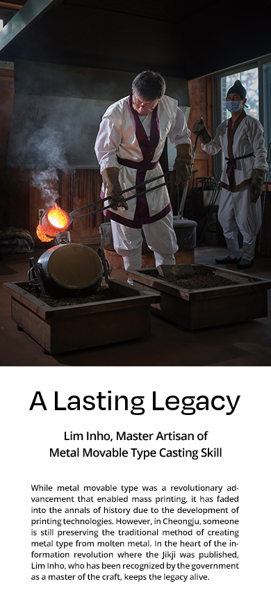 Lim Inho, a craftsman of Korean metal movable type, holds tight to the traditional methods of making type out of molten metal. He’s also the only person to be officially recognized as a master artisan of the art. “I started out by carving letters out of wood. It was after meeting my mentor Oh Guk-jin that I started making movable type. That’s when I became enchanted with its beauty,” he said.