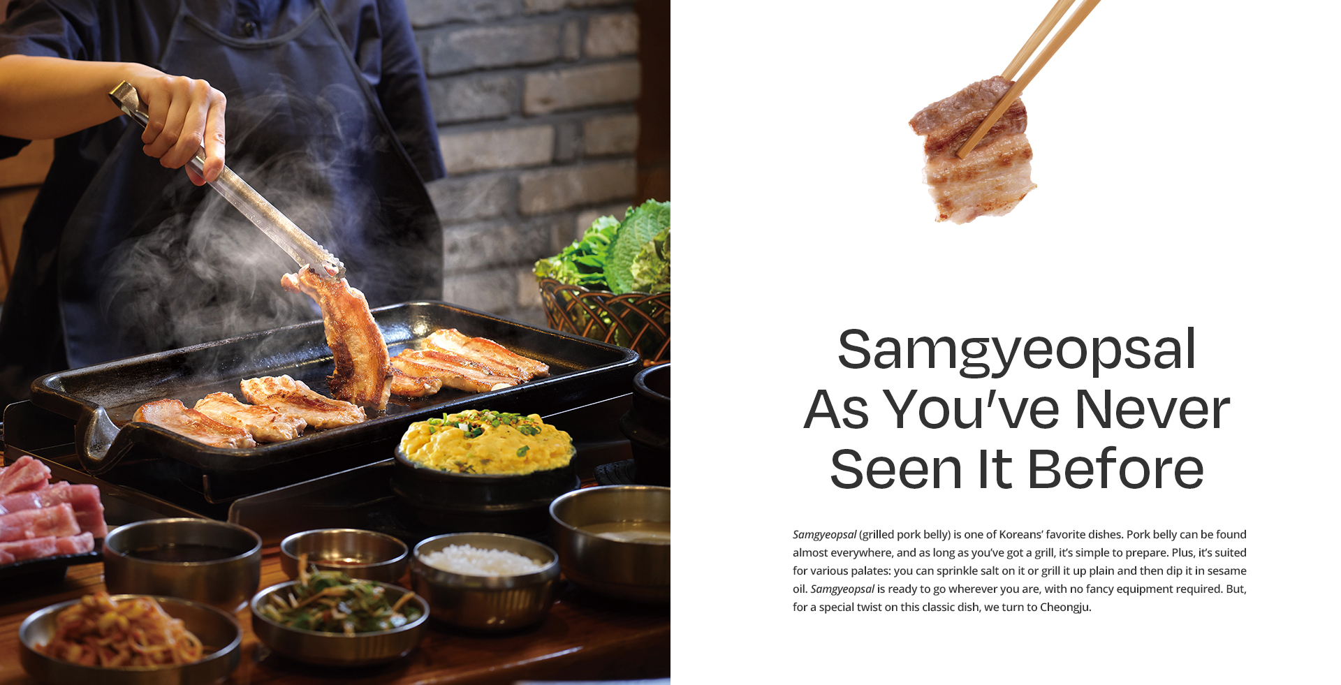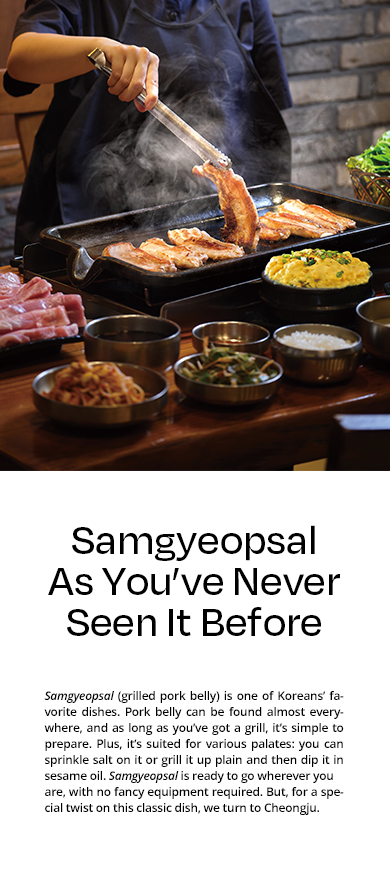 Cheongju’s distinctive take on samgyeopsal, which is now officially known as Cheongju samgyeopsal, is becoming known as a regional delicacy. There’s even an alley dedicated to Cheongju-style samgyeopsal in Seomun Market. Stroll around the market in the morning, and you’ll encounter the syrupy smell of ganjang on the boil; come back in the evening, and you’ll smell the mouthwatering aroma of samgyeopsal being grilled at every restaurant.