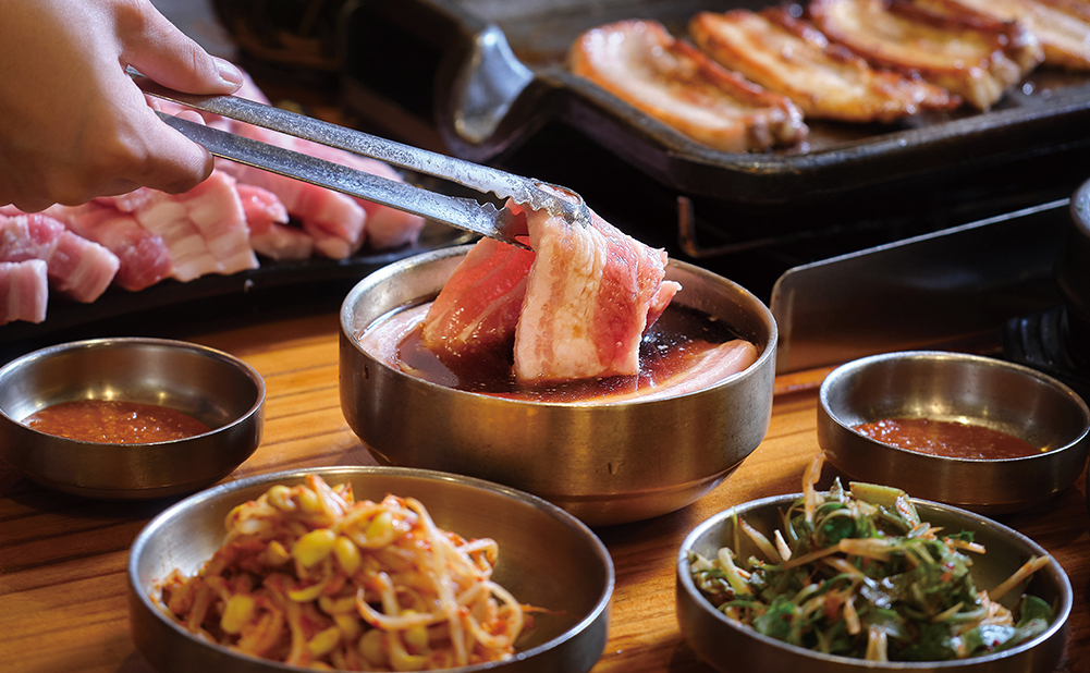 So, what’s the point of adding ganjang to samgyeopsal in Cheongju? In the past, uncastrated male pigs (boars) were butchered for their meat, which often resulted in an unpleasant odor called boar taint. Cooks tried adding ganjang to pork belly to eliminate that smell, which had the unintended effect of tenderizing the meat. Soon, customers began seeking out ganjang samgyeopsal. That trend settled into a tradition that’s now a distinctive feature of Cheongju samgyeopsal.