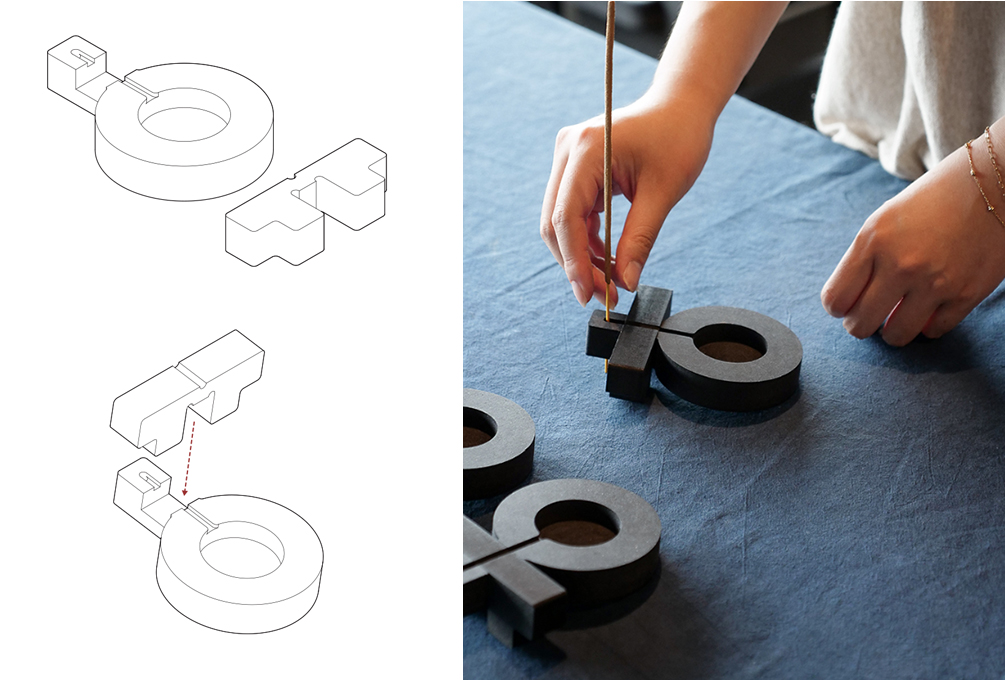 Incense stick holder designed to resemble the Korean consonant ‘ㅎ.’ It is composed of two parts for easy assembly and disassembly, and is designed to be placed inside the circular part of the ‘ㅎ’ character.The materials used in furniture production are diverse, and among them, natural wood stands out as the most environmentally friendly choice. For Park who contemplated ways to minimize waste and enhance recyclability while creating furniture with natural wood, an unexpected solution emerged. It came from a traditional method―when crafting traditional furniture in Korea, artisans employ the “interlocking joint technique.” This technique involves fitting pieces of wood together without the use of adhesives or nails. Park remarked, “Compared to furniture assembled with adhesives or nails, the assembly and disassembly process is much simpler, and the work itself is enjoyable. I also found great satisfaction in the visual stability and structural integrity inherent in the interlocking structure.”